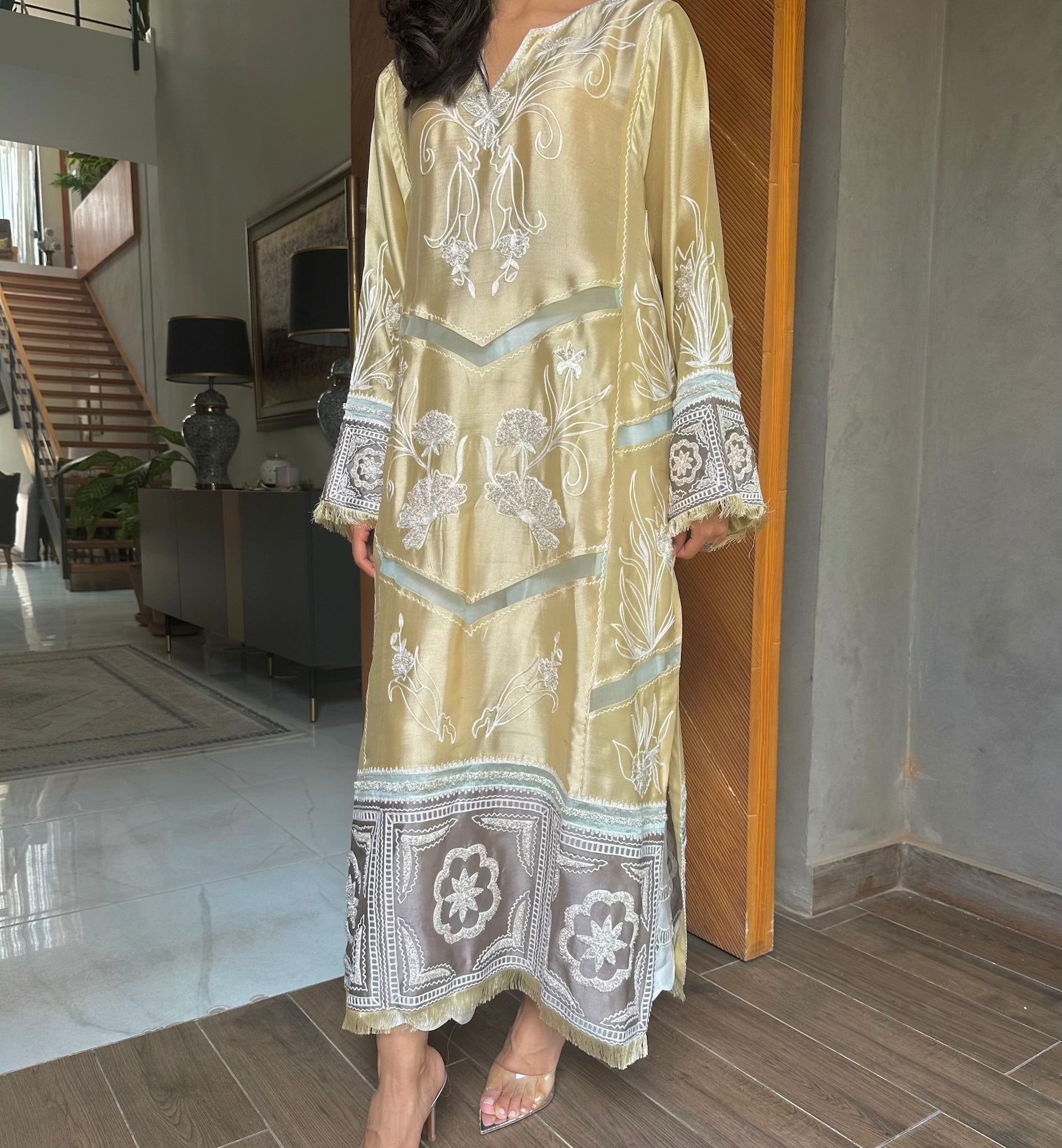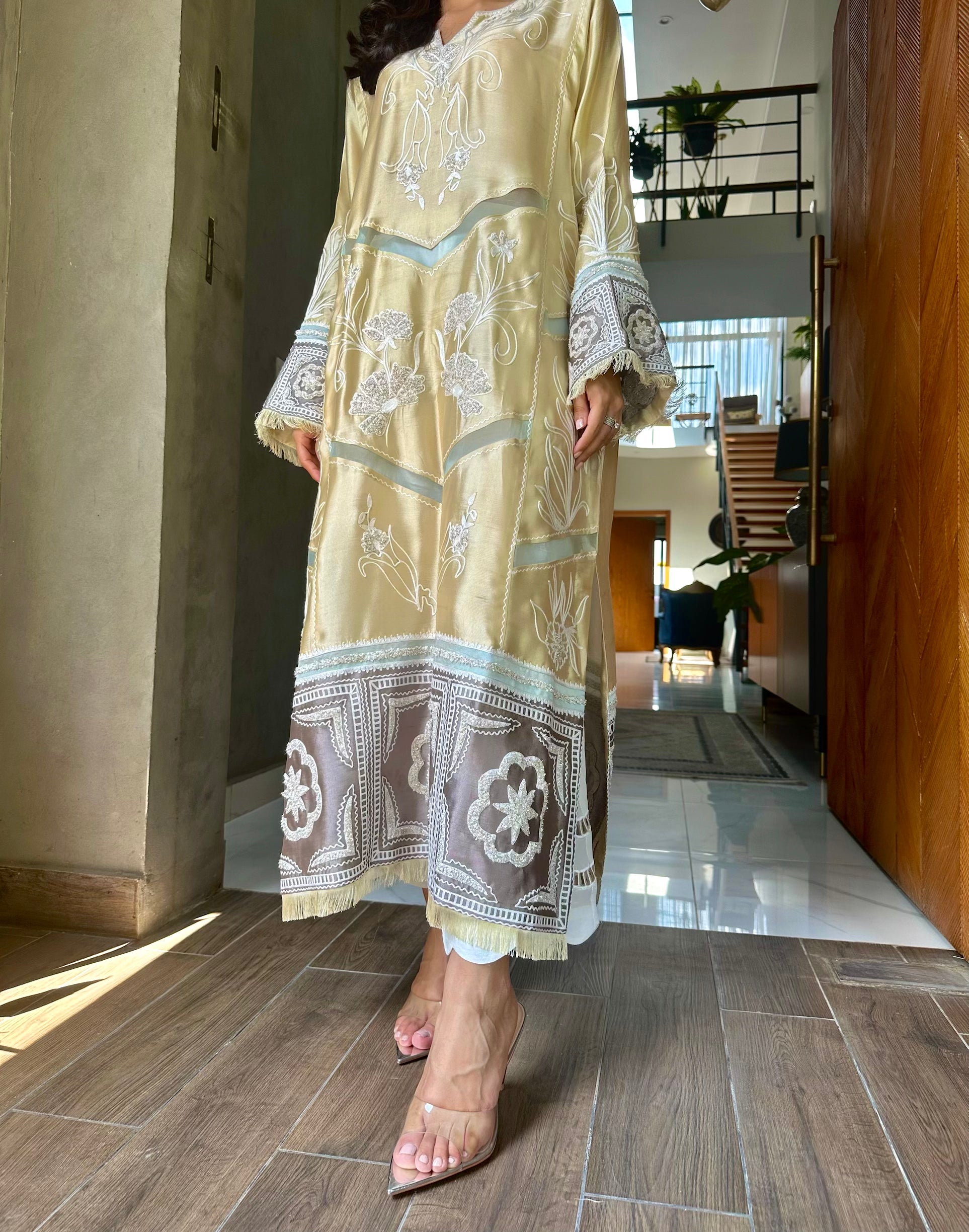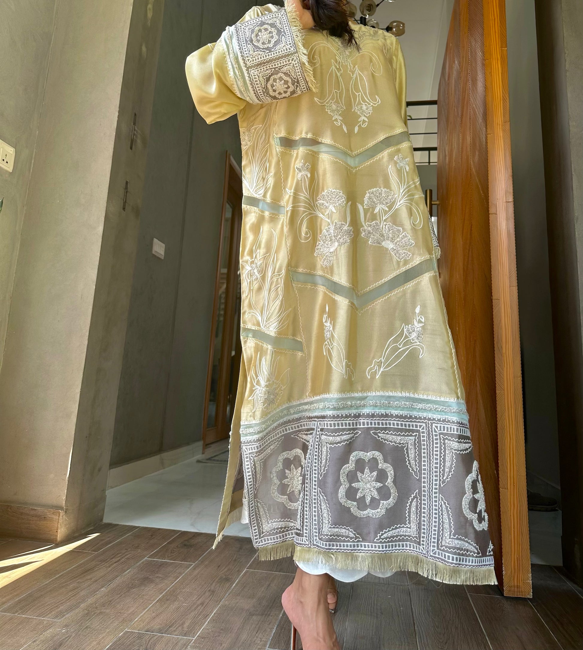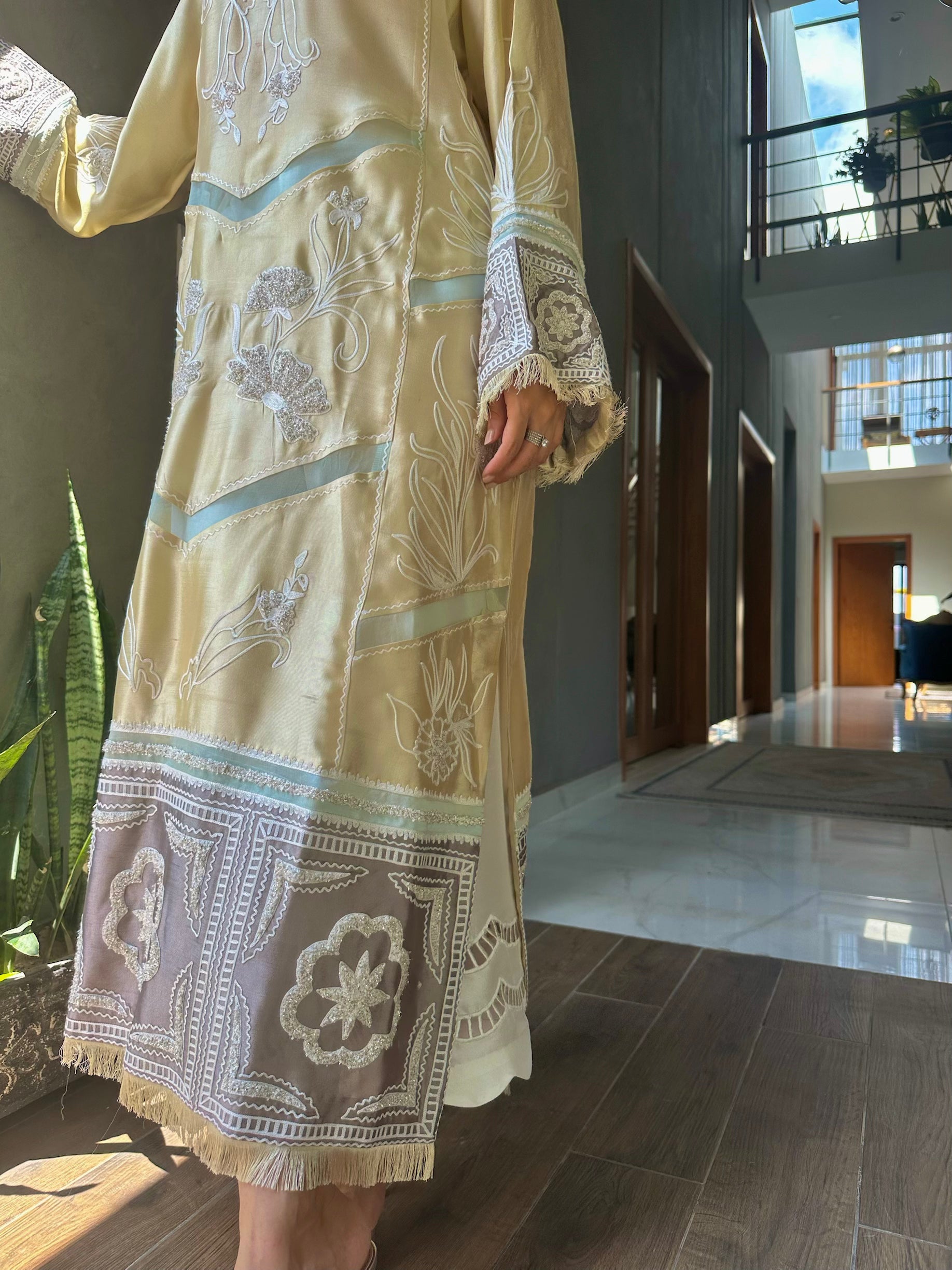 A butter-yellow 2-piece with intricate aari work, accented by turquoise and grey inserts. The long Shisha silk flowy kurta pairs effortlessly with a plain cotton silk izaar, making it a graceful blend of tradition and modern charm.