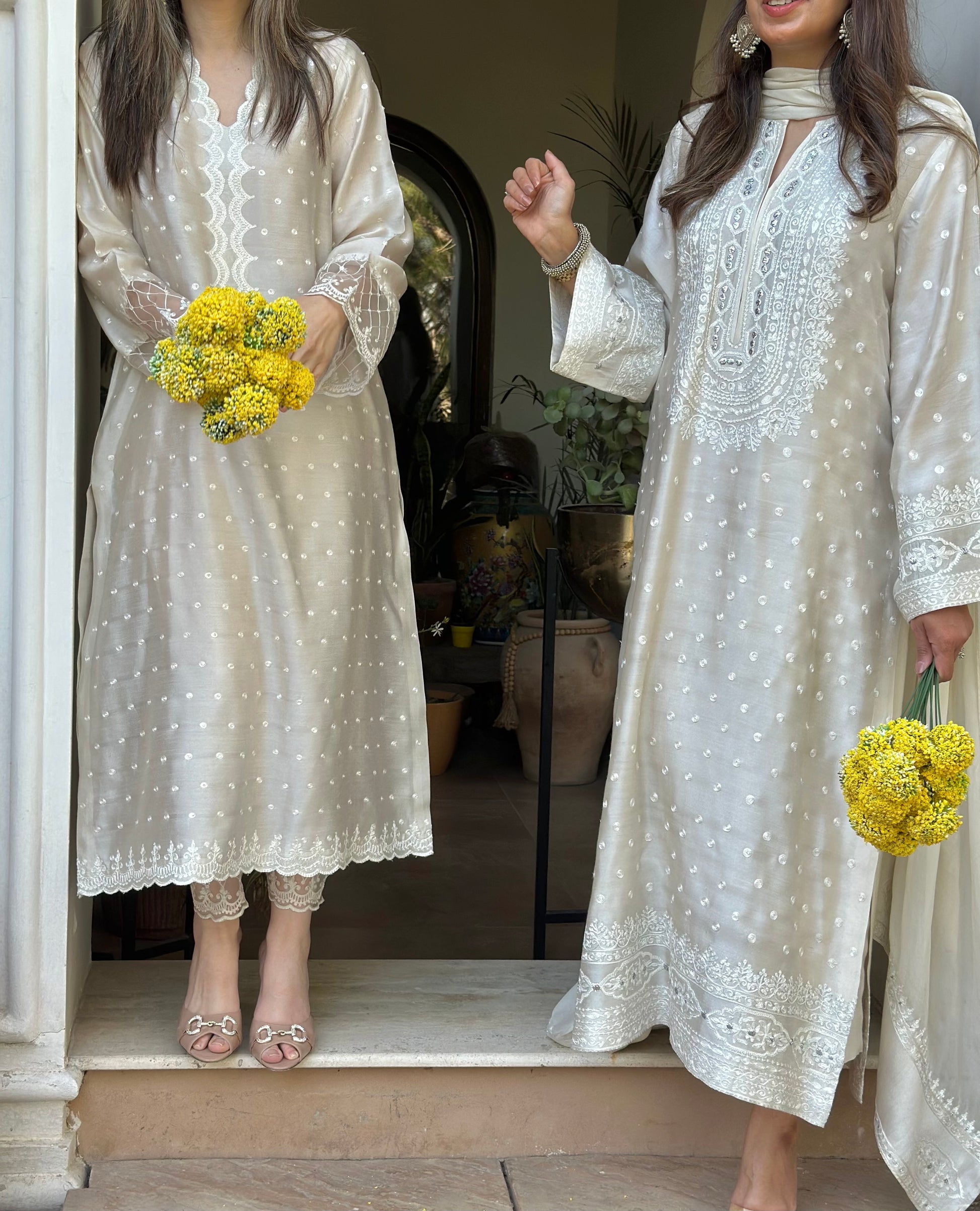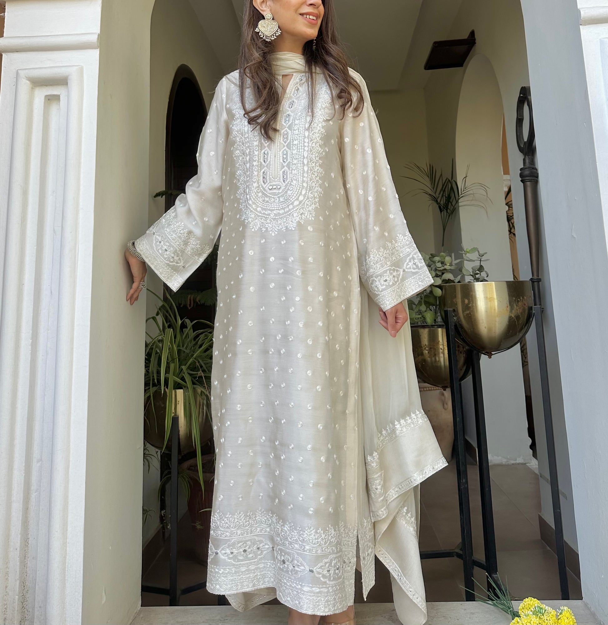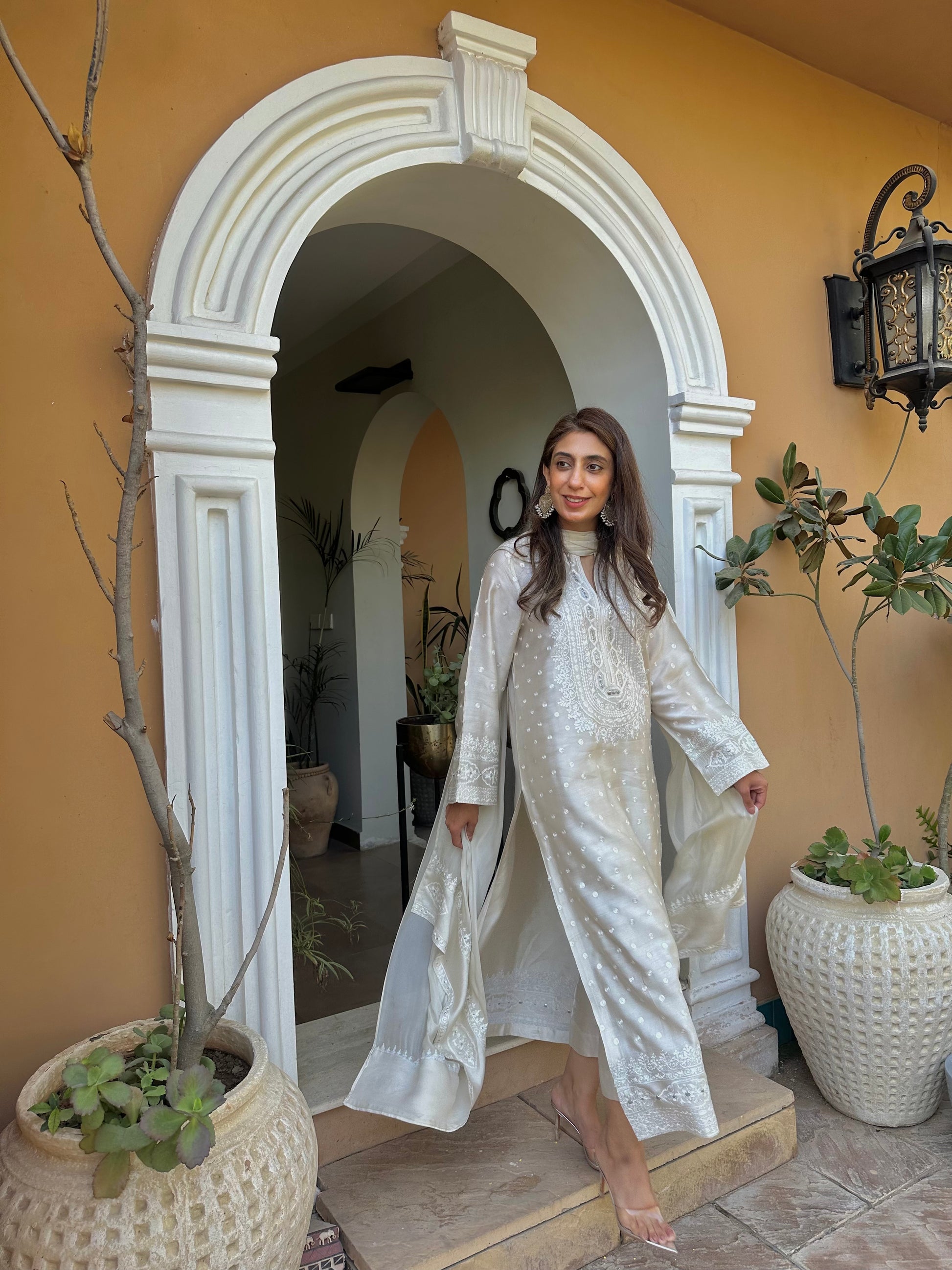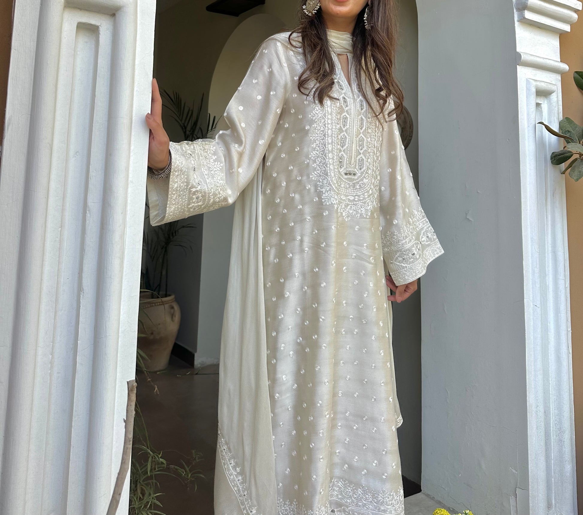 An elegant ivory khaadi silk ensemble adorned with subtle polka dots and delicate embroidery on the neckline, sleeves, and hem in shades of pearl white, accented with a hint of silver badla. Paired with a matching izaar and a silk dupatta featuring embroidered pallus, it offers a look of understated luxury and timeless grace.