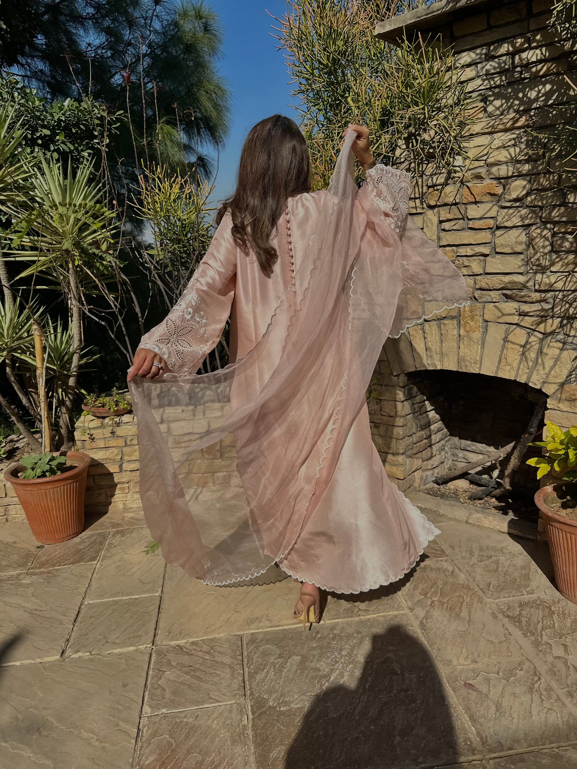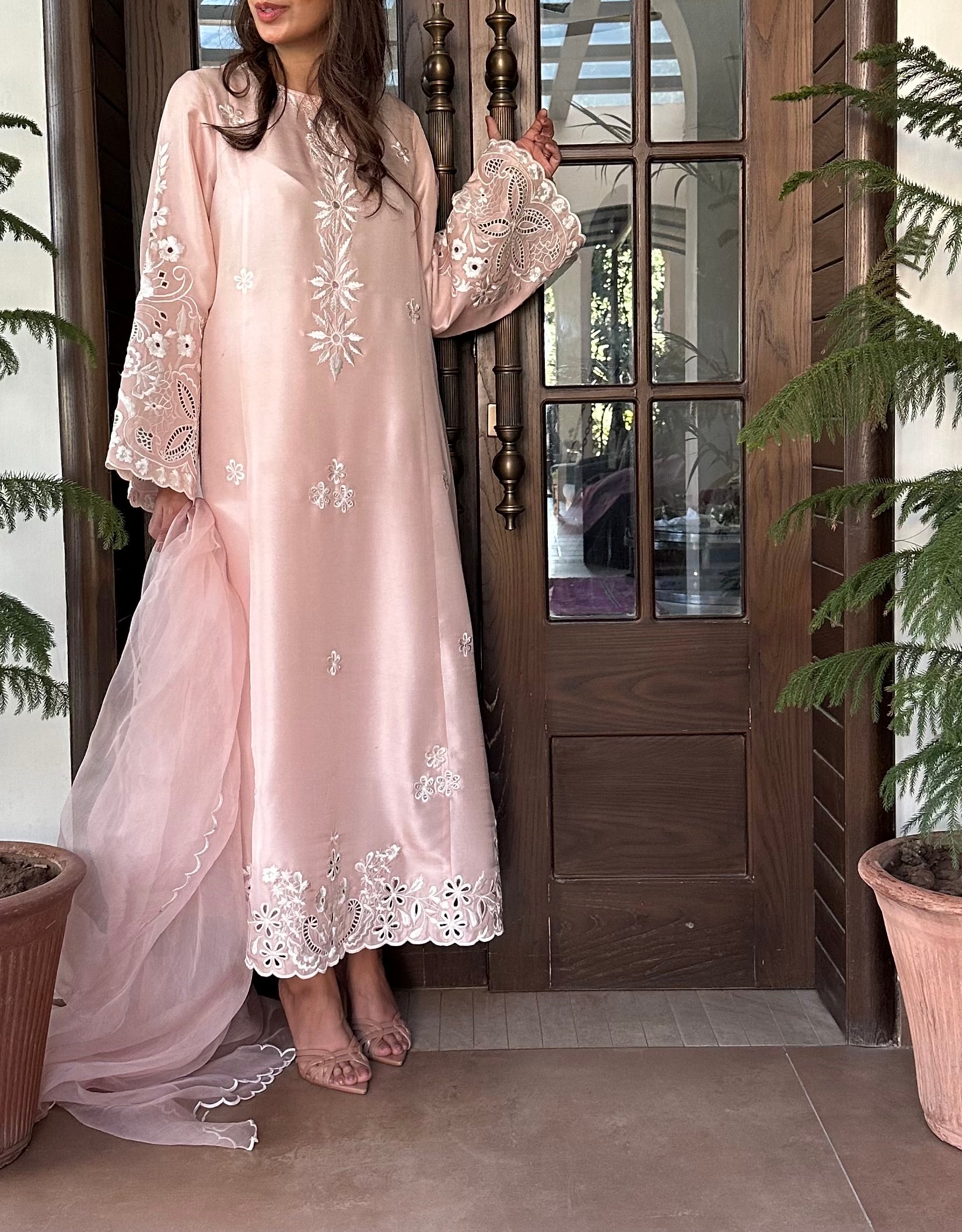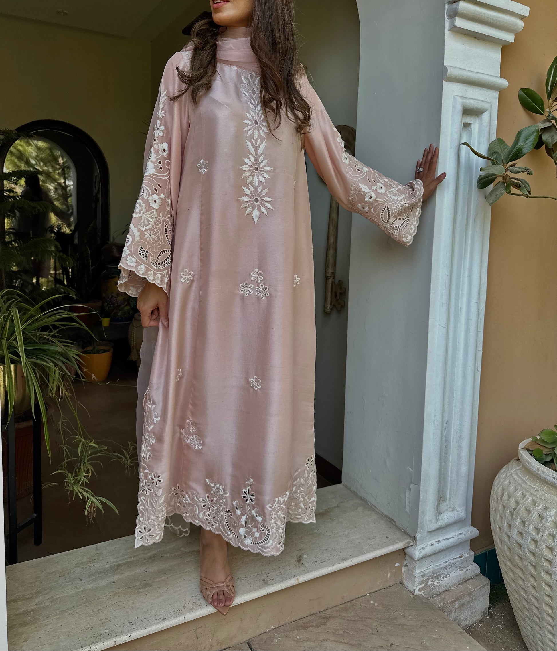 A refined A-line ensemble crafted from pure 80g raw silk in a soft powder pink hue, featuring intricate cutwork embroidery on the neckline, sleeves, and hem that showcases delicate craftsmanship. Paired with straight pants and a scalloped organza dupatta, it reflects understated elegance.