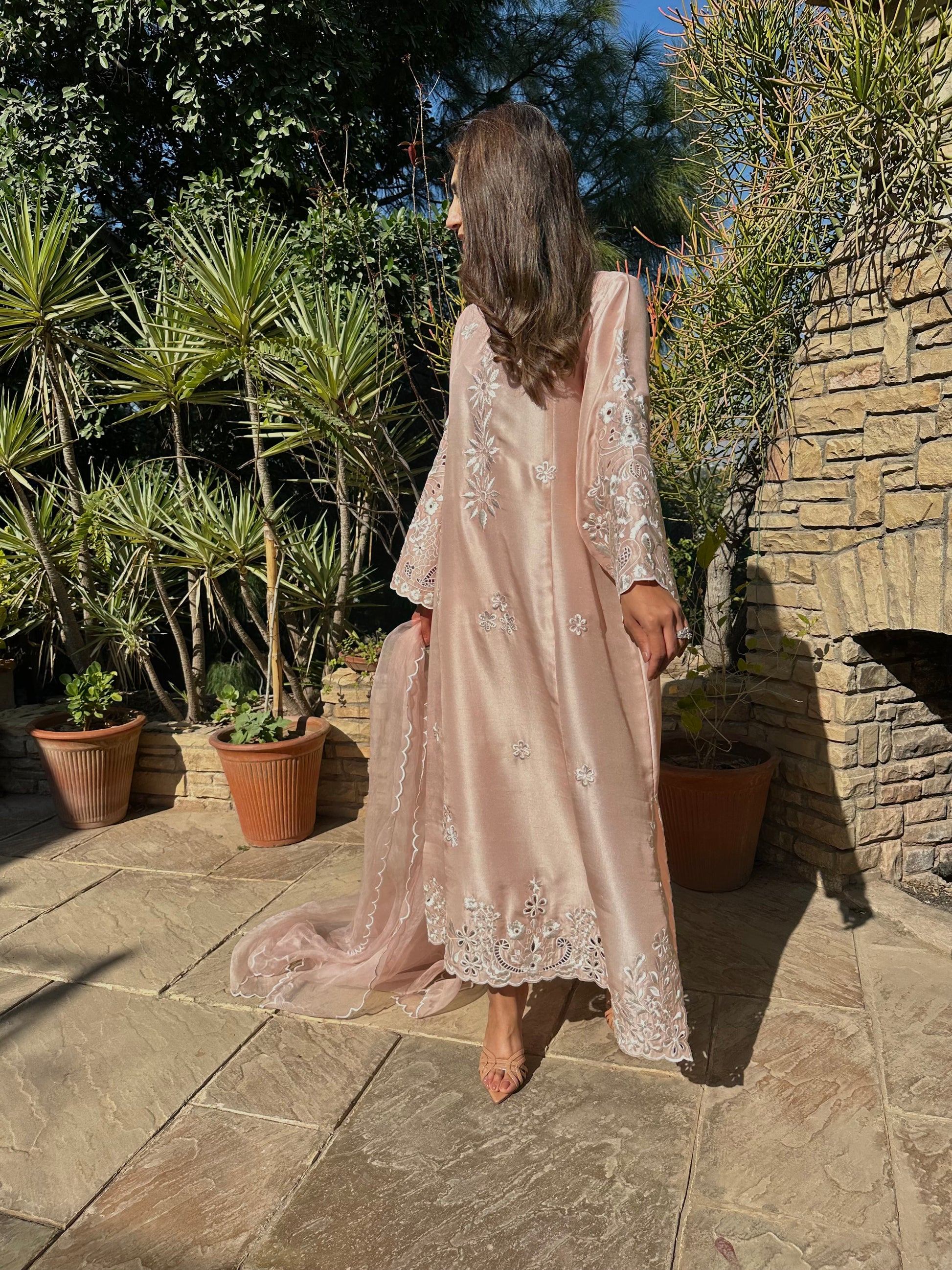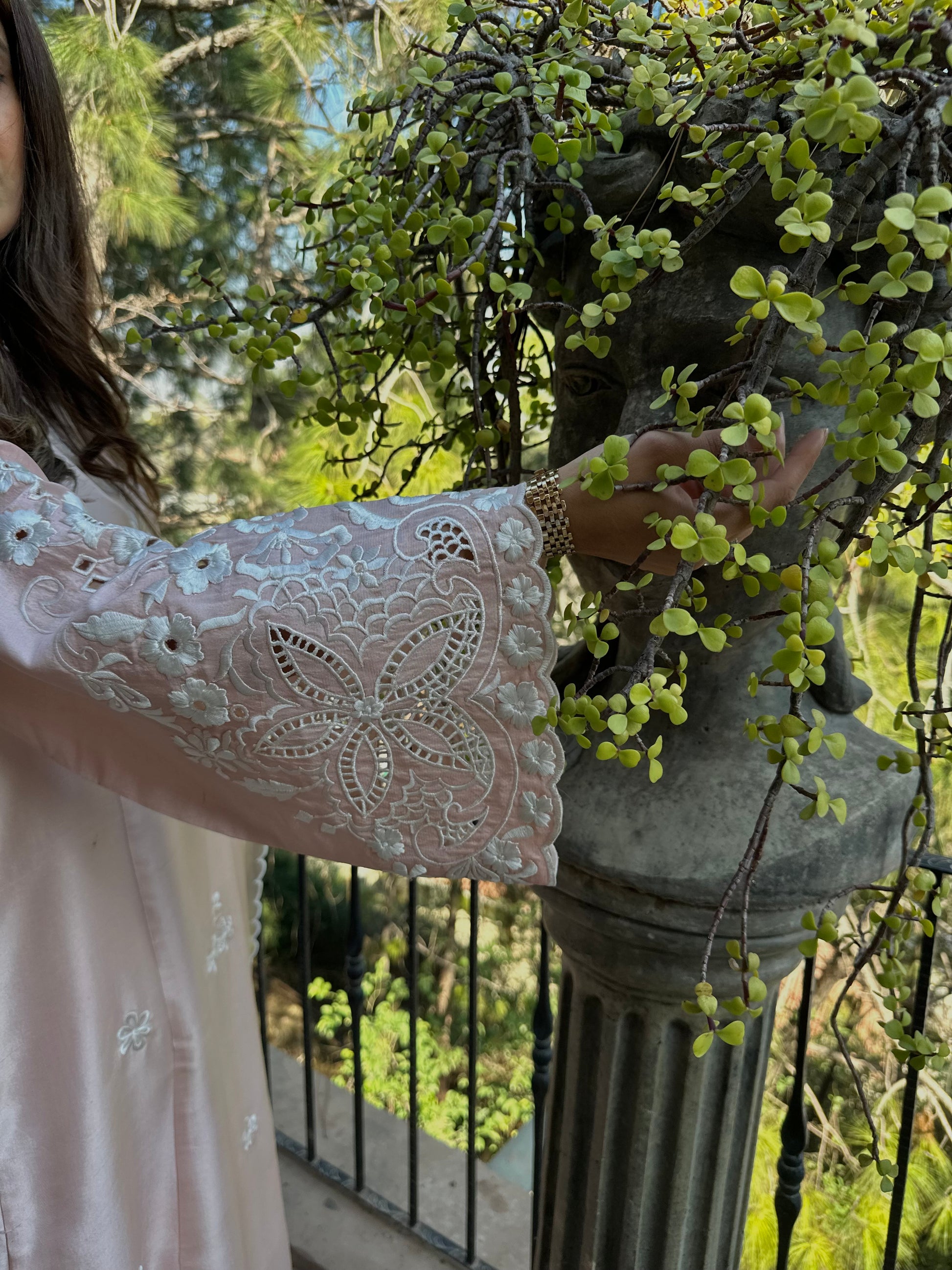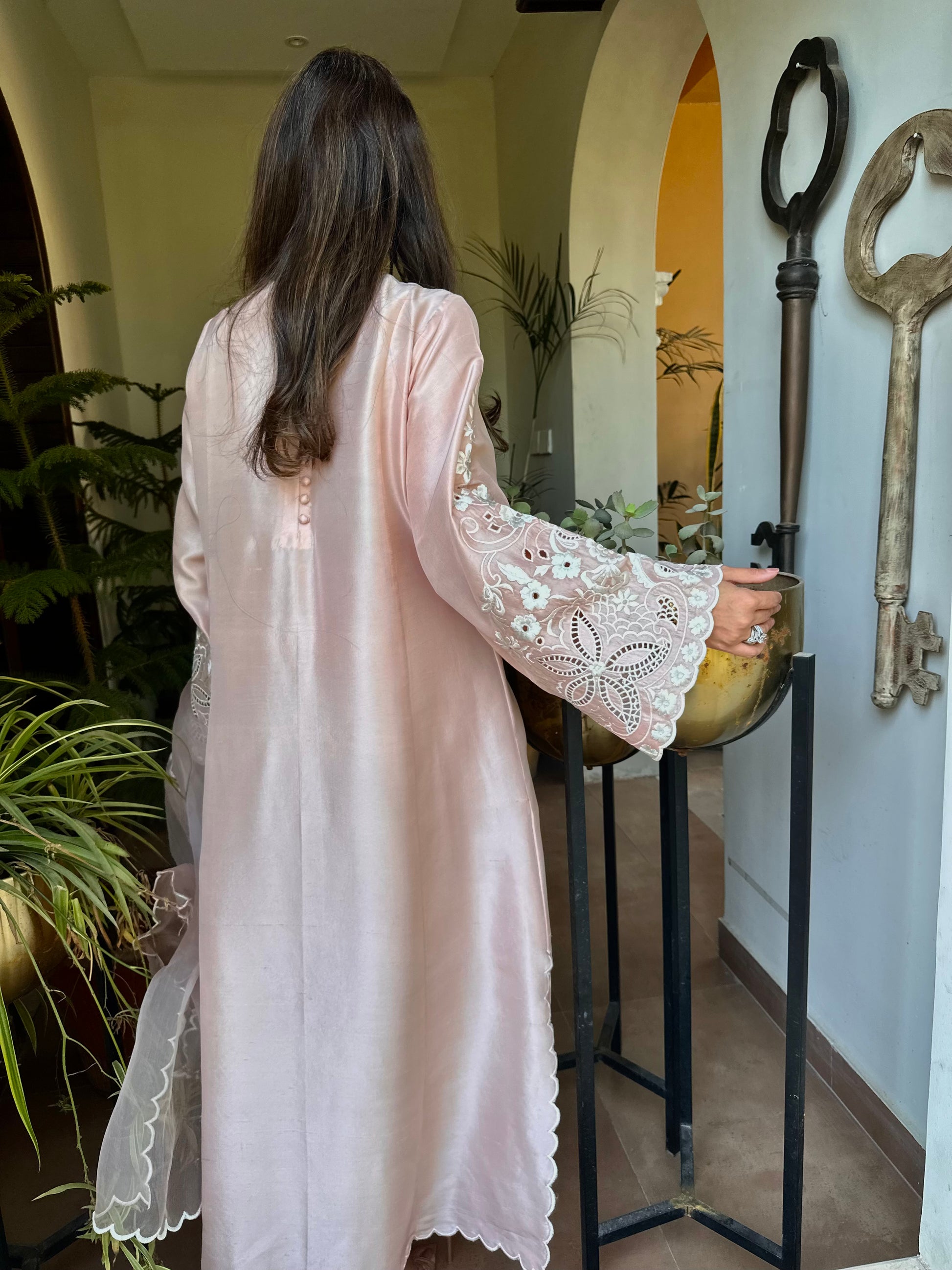 A refined A-line ensemble crafted from pure 80g raw silk in a soft powder pink hue, featuring intricate cutwork embroidery on the neckline, sleeves, and hem that showcases delicate craftsmanship. Paired with straight pants and a scalloped organza dupatta, it reflects understated elegance.