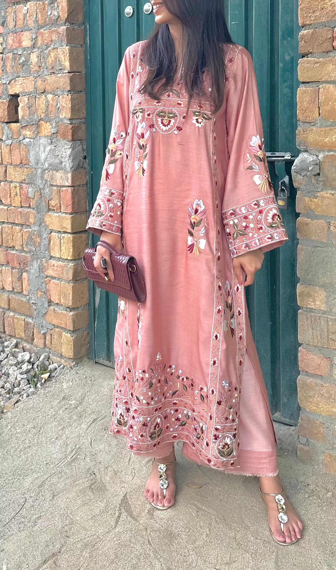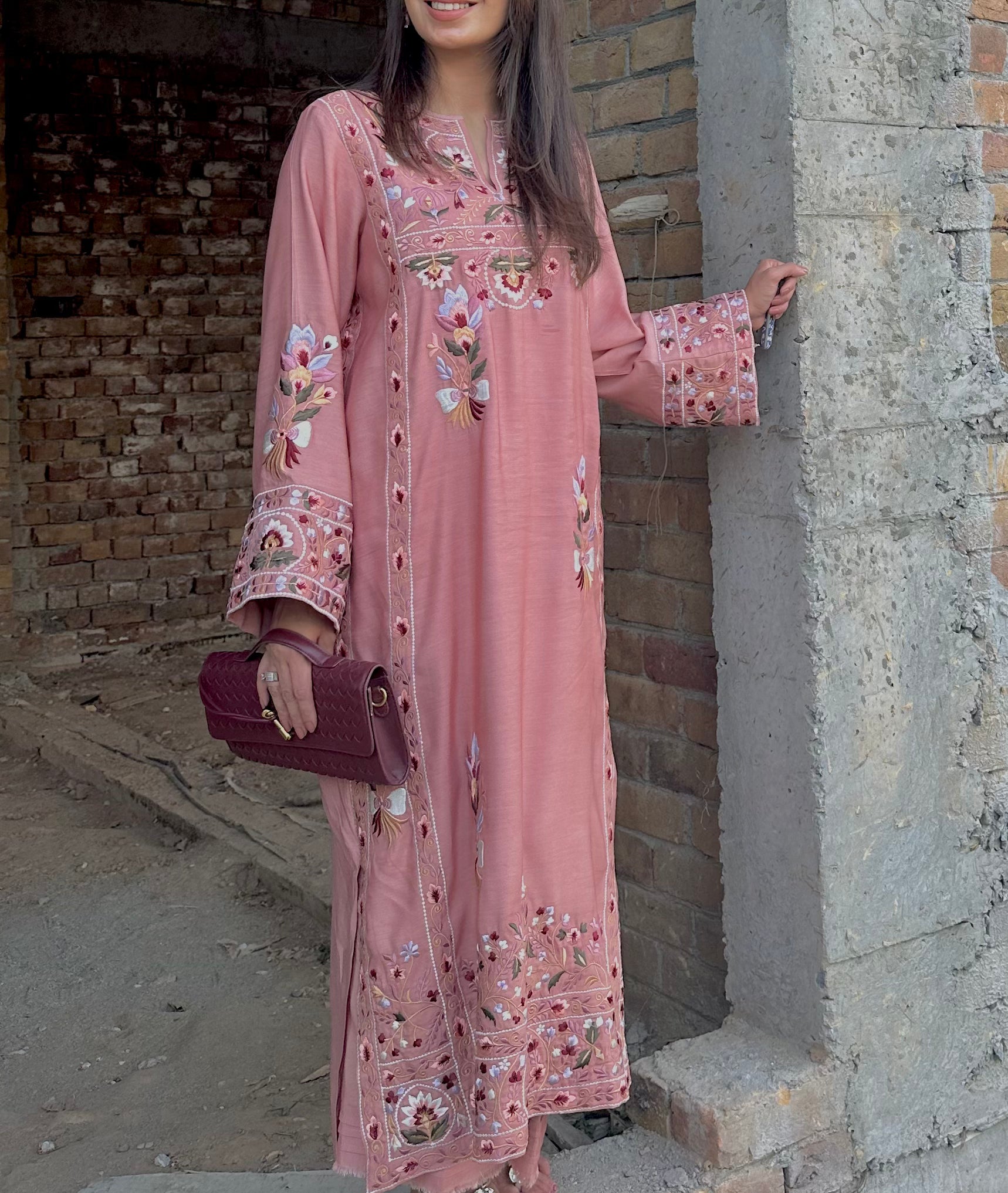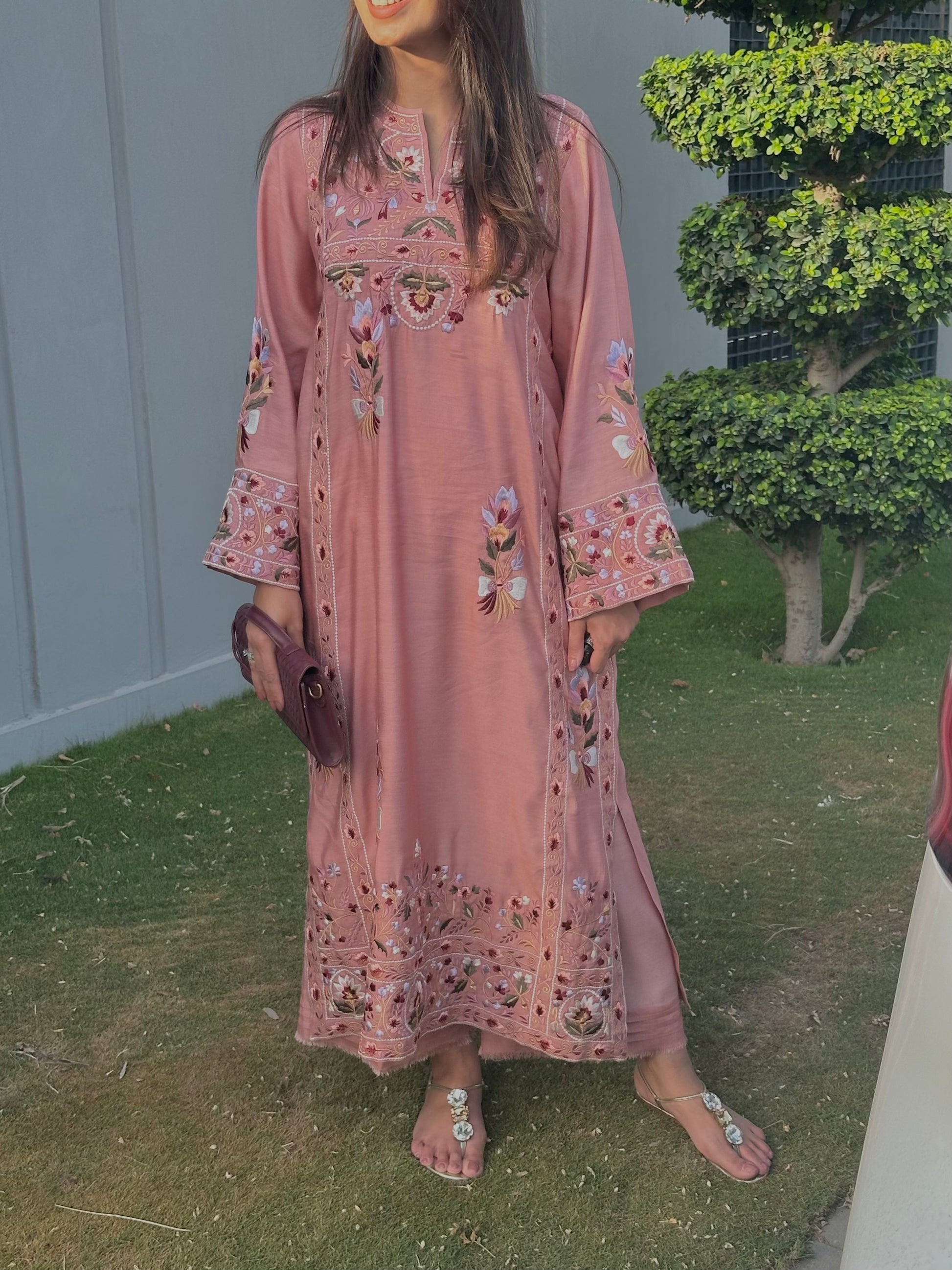 In a soft salmon pink hue, this khaadi silk ensemble is adorned with intricate multi-shade resham embroidery and delicate mirror detailing. Paired with a matching izaar, it beautifully blends traditional charm with contemporary elegance.